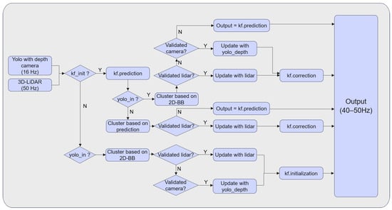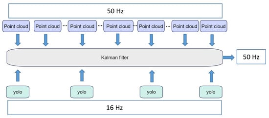 The tracking of the UAV’s 3D position is accomplished using a Kalman filter, as depicted in Figure 10. The Kalman filter takes the output of the YOLO detector with depth information (operating at a frequency of 16 Hz) and the 3D point cloud data from the 3D LiDAR (operating at a frequency of 50 Hz). By decoupling lidar and visual information processing, the output frequency can be comparable to that of lidar, close to 50 Hz, at a low computational cost. Figure 11 presents the details of Kalman filter processing.