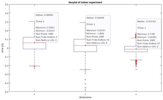 Boxplot of position errors in x, y, and z directions in indoor experiment.