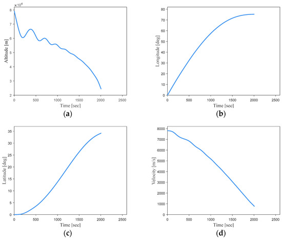 is the aerodynamic reference area. is the atmospheric density. and are the lift and drag coefficients, respectively. The control vector is represented by [,] where is the angle of attack.