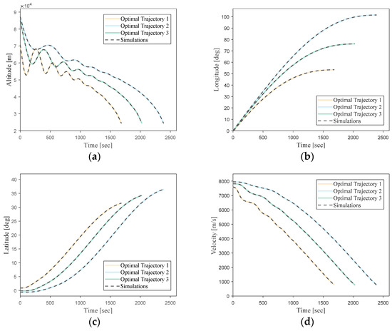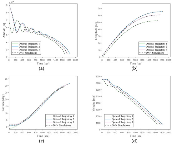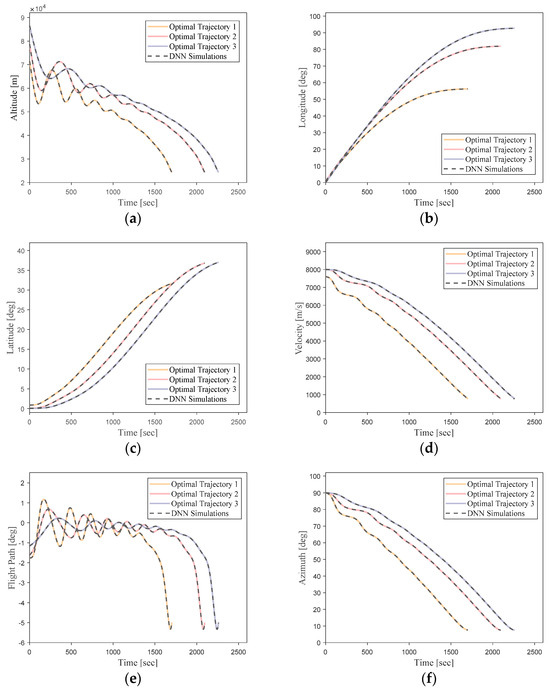 To provide a more visual representation of the simulation results, three trajectories were randomly selected, as shown in Figure 7. The results indicate that the optimal trajectory sample data used for network training possess high-fidelity optimization quality. It is noteworthy that the subsequent training and validation data of optimal trajectories have all undergone simulation verification to ensure their accuracy.