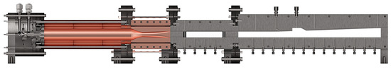 The VAH’s cross-section is circular, while the isolator section of the supersonic combustor has a square cross-section with an edge length of 2.0 mm. Consequently, when the high-enthalpy flow is channeled from the VAH to the isolator, a non-uniform flow and boundary layer may be formed. To mitigate this, CRST nozzles were conceived to suppress flow inhomogeneity and generate an optimal boundary layer [58]. Leveraging cross-sectional data derived from the two-dimensional axisymmetric Method of Characteristics (MOC) design, the 3D CRST nozzle was developed by integrating the shape transition function, accounting for the cross-sectional shift from circular to square. The three-dimensional steady-state numerical analysis results validated the achievement of a homogenous Mach number distribution and the development of a homogenous boundary layer in the CRST nozzle exit region [58].