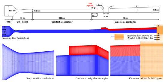 The computational domain is from the downstream of the vitiation air heater (VAH) to a wake region after the exit of the supersonic combustor. Figure 2 illustrates the entire computational domain, excluding the wake region of the supersonic combustor. To impose an accurate mass flow rate, the entire computational region was transformed into the area ratio of a square duct with a width of 2.0 mm. The isolator is 350 mm long from the endpoint of the circular-to-rectangular shape transition (CRST) nozzle. From the end of the isolator, an expansion angle of 2° was applied to the upper wall of the combustor. Gaseous hydrogen is injected at a 30° angle. Originally, the fuel injection port was an oval shape with a shortened axis of 2.0 mm and a longer axis of 3.675 mm. For the two-dimensional numerical simulation, the fuel injection port was transformed into a slit with a width of 0.029 mm. The cavity has a ramp angle of 60° and a length-to-depth ratio of 3.