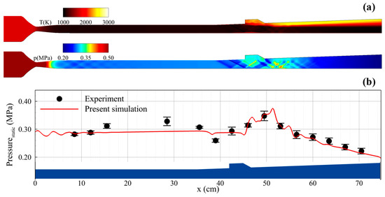 (a) Time-averaged results of static temperature and pressure field under the validation condition of PND-DCSC, (b) comparison between measured and calculated lower wall pressure.