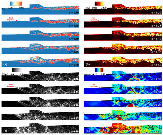 Instantaneous result of (a) the concentration of the OH mass fraction, (b) temperature distribution, (c) pressure gradient, and (d) pressure field depending on the global equivalence ratio.