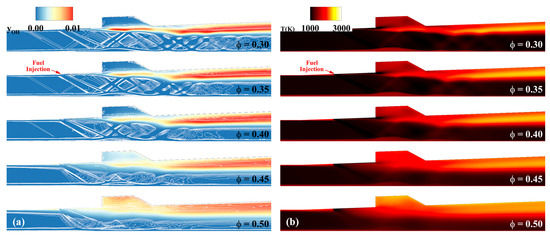 Time–averaged result of the (a) OH mass fraction distribution and density gradient and (b) temperature distribution according to the global equivalence ratio.