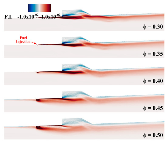The transition in combustion mode accompanies the variation in combustion regimes with changes in the equivalence ratio. The time–averaged Takeno flame index [67], used to distinguish non-premixed and premixed combustion regimes according to the combustion mode, is depicted in Figure 6. At an equivalence ratio of 0.30–0.40, where the cavity shear-layer combustion mode characteristics were observed, strong premixed combustion traits were evident exclusively along the fuel stream. At an equivalence ratio of 0.3, this premixed combustion region is extended upstream of the combustor. As the equivalence ratio increased to 0.40, the premixed region gradually diminished, yet the trend persisted, and the non-premixed combustion characteristics dominated inside the cavity. With an increase in equivalence ratio to 0.45, non-premixed and premixed combustion traits were observable in the jet-wake region following fuel injection. This suggests that the fuel injected at an equivalence ratio of 0.45 promptly penetrated the main flow, mixing and burning thereafter. This sort of numerical result shows that an equivalence ratio of 0.30–0.40 presents the cavity shear-layer combustion mode, and above 0.45 has the jet-wake combustion mode.