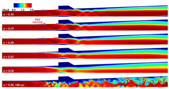 To confirm the operating mode under each equivalence ratio, both time–averaged and instantaneous results for the Mach number distribution, represented by the Mach line as a white iso-line, are depicted in Figure 7. At the low equivalence ratios ranging from 0.30 to 0.40, which exhibited a cavity shear-layer combustion mode, large separation regions were consistently observed along the lower wall of the combustor. Additionally, the acceleration and deceleration of the Mach number, resulting from the shockwaves and expansion fan structure induced by fuel injection, were noticeable. As the equivalence ratio exceeded 0.45, the large separation region along the lower wall was significantly reduced. Subsonic regions were formed between the fuel injector and the cavity. This subsonic region expanded progressively with an increase in the equivalence ratio. At an equivalence ratio of 0.50, the Mach number of the main flow notably decreased around a Mach number of 1.5. There was a decline in the local Mach number. However, it did not fall below sonic conditions. Consequently, considering the operating mode, the time-averaged Mach number distribution indicated that the scram mode was sustained across all equivalence ratio conditions. Nonetheless, the instantaneous results in Figure 7 demonstrate a mode transition from scram to weak ram with thermal choking.