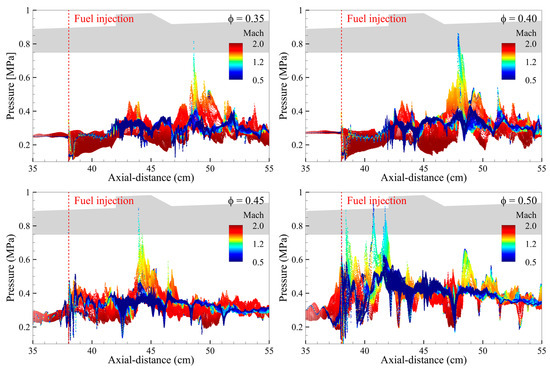 For a more quantitative analysis, an x-P-M scatterplot was generated, depicting the relationship between Mach number and static pressure, as shown in Figure 8. The x-axis of the scatterplot corresponds to the axial distance from the exit of the isolator to the upstream section of the supersonic combustor, while the y-axis represents static pressure. The contour represents the Mach number distribution. By abstracting spatial information from the depicted region, the x–P–M scatterplot offers a significant advantage: facilitating an effective quantitative analysis of pressure and Mach number distributions along the axial direction. Figure 8 shows that the region of maximum combustion pressure anchored points towards the cavity region to the fuel injection region as the equivalence ratio increases. Owing to numerous grid points being concentrated to investigate boundary layer behavior and separation regions along the wall, the physical properties near the wall, where no-slip adiabatic conditions were applied, might be accentuated. Nonetheless, at equivalence ratios of 0.35 and 0.40, the region between the fuel injector and the cavity remained supersonic, with only a small section after the cavity exhibiting subsonic behavior within the combustor. Except for these regions, there were no instances of the entire longitudinal axis being subsonic. Thus, the operating mode at equivalence ratios of 0.35 and 0.40 can be deemed to consistently maintain the scram operating mode, as indicated in Figure 7. However, in the x-P-M scatterplots obtained at equivalence ratios of 0.45 and 0.50, several subsonic points were evident, particularly in the fuel injection region and the front wall of the cavity. This suggests that a transition from the scram mode to the thermal choking mode or weak ram mode occurs intermittently in these equivalence ratios. Nevertheless, considering the limited extent of the subsonic region and the findings of the time-averaged Mach number distribution presented in Figure 7, it is improper to propose a complete shift in operating mode to ram or weak ram mode. Consequently, the analysis confirms that most flow fields consistently maintained a thermally unchoked and supersonic state, with the operating mode only intermittently shifting to weak ram mode. These transitions to weak ram mode occur intermittently over a very short time window relative to the total operating time. This is a combustion instability-induced phenomenon, and it will be explained in the following section.