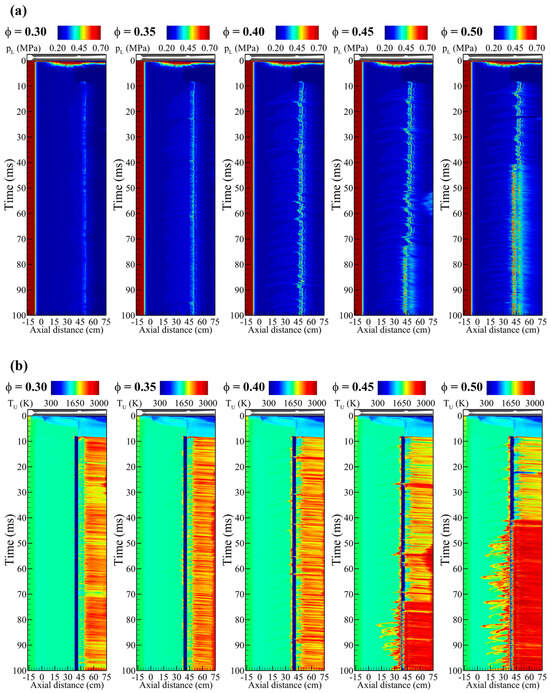 x–t diagram (a) of the pressure distribution on the lower wall and (b) the temperature distribution on the upper wall of the combustor region according to the global equivalence ratio.
