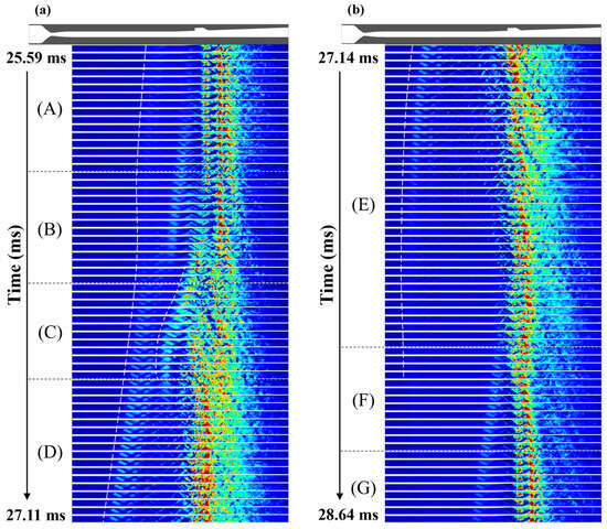 Instantaneous result of the chronologically illustrated pressure field distribution; (a) 25.58–27.10 ms, (b) 27.11–28.63 ms.: (A) propagation of the primary upstream-traveling shock wave, (B–C) formation of the secondary upstream-traveling shock wave, (D–E) repropagation and dissipation of the upstream-traveling shock wave, (F–G) regeneration of the primary upstream-traveling shock wave.
