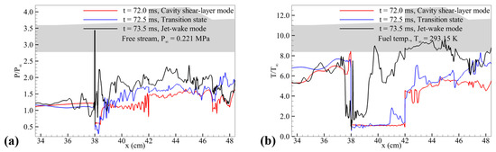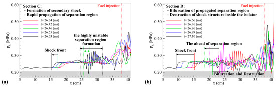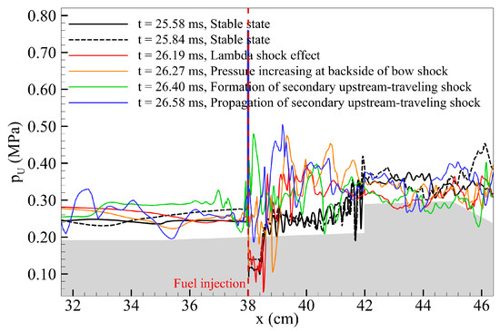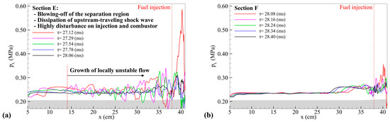 The results of section (E) obtained at 27.12 ms in Figure 17 show that the local flow field perturbation induced a strong combustion instability near the fuel injection region, resulting in a maximum combustion pressure of 0.6 MPa. This dissipation progressed until most shock structures collapsed, except for the leading upstream-traveling shock wave. The leading upstream-traveling shock wave maintained a pressure level higher than the free stream pressure of 0.22 MPa until 27.29 ms. After that, the pressure level in the isolator gradually decreased due to the dissipation of the shock. Due to the combustion instability caused by the exhaustion process of the upstream-traveling shock wave, which was observed throughout section (D)–(E), the combustor could not switch to the cavity shear-layer stabilized combustion mode. After reaching section (F), the dissipation of shock waves in the insulator was completed. At the same time, the combustion mode was stabilized. Section (F) of Figure 17 shows the formation of a stabilized pressure field in the combustor. The pressure distribution of the stabilized flow field is consistent with that shown in section (A). However, a primary upstream-traveling shock wave was simultaneously formed and gradually propagated into the isolator.