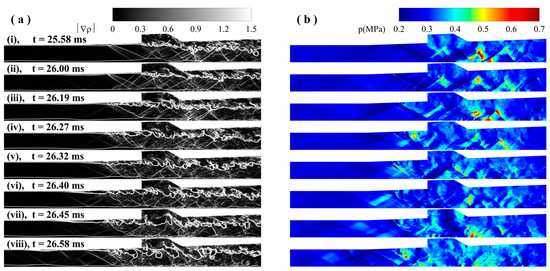 Instantaneous result of the (a) density gradient and (b) pressure field distribution at the time range of the secondary upstream-traveling shock wave formation: (i) the state of cavity shear-layer stabilized combustion mode, (ii) formation of the reflected shock waves and the initiation of disturbance on the fuel stream, (iii–iv) increase in the pressure at the backside of the bow shock, (v–vii) pressure propagation into the isolator, (viii) highly unstable state for fuel injection region.