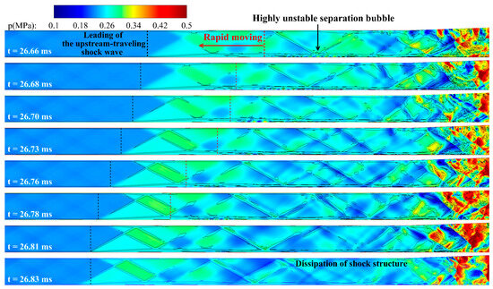 The propagation process and bifurcation of the separation region during the formation of the secondary upstream-traveling shock wave is shown in Figure 13 and Figure 14. At 26.34 ms of an early stage of section (C), the separation bubble propagating toward the isolator is exhibited on the lower wall. However, due to the high propagation velocity, this separation continuously interacted with the oblique shocks generated by the primary upstream-traveling shock wave. Starting from 26.46 ms, the separation region became highly unstable. The pressure fluctuation distribution within the separation region is consistent with the LES/DNS results and its modal analysis tendencies for shock wave–boundary layer interaction (SBLI) instability [69,70]. The separation bubbles grew and spread rapidly upstream of the isolator until about 26.76 ms. Soon, however, the unstable bubbles were bifurcated, and the downstream bifurcated region was pushed back into the combustor. The front of the bifurcated bubble traveled upstream of the isolator with the secondary shock and propagated the primary upstream-traveling shock wave forward.