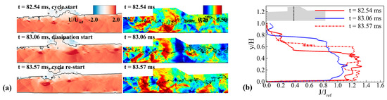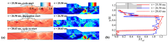 (a) Instantaneous results of the normalized x-direction velocity component (iso-line: U/Uref = 0.1), pressure field (iso-line: Mach number 1.0), and (b) normalized jet momentum ratio along the height direction.