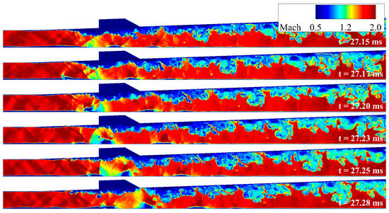 Due to the rapid expansion of the shock structure, as shown in sections (C) and (D), the downstream shock waves begin to dissipate. In addition, due to the formation and propagation of the upstream-traveling shock wave, the expansion wave or shock wave structure near the injector that appeared under the stable condition was no longer formed. Figure 15 shows the instantaneous results at the initiation of the instability cycle and the beginning of the dissipation of the upstream-traveling shock wave. The velocity contour indicated that the effective cross-sectional area increased significantly when the primary and secondary upstream-traveling shock wave was in the isolator. When the expansion fan and the injector-induced shock wave structure were destroyed, the large separation zone formed on the lower wall also collapsed. These collapses rapidly increased the effective cross-sectional area at the combustor inlet, which was accompanied by a decrease in back pressure. The ratio of the jet momentum along the height direction of the combustor to the averaged value in the separator is shown on the right side of Figure 15. The effective cross-sectional area expanded starting from approximately 26.58 ms, rapidly increasing the jet momentum ratio, which released the backpressure and exhausted the mainstream. The increase in effective cross-sectional area induced by the collapse of the shock wave structure near the injector does not return to its original state (i.e., a stable state accompanied by decreasing cross-sectional area until upstream-traveling shock wave propagating to the isolator are entirely exhausted). Therefore, the dissipation and exhaustion of the shock structure in the isolator were accelerated. The dissipation of the upstream-traveling shock wave in the isolator progressed during the (D)–(E) section. During this process, the separation bubbles on the wall formed by the shock structure in the isolator were blown off. The detached bubbles develop into a locally low Mach number and high-pressure region. Figure 16, which illustrates a certain temporal period of section (E), shows that the blown-off bubble entered the combustor region and caused instability in the flow field of the combustor. Most of the main flow remained supersonic, but the blown-off bubble significantly reduced its velocity, and this phenomenon occurred continuously throughout section (E).