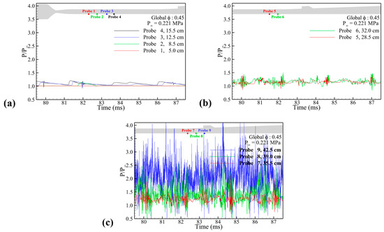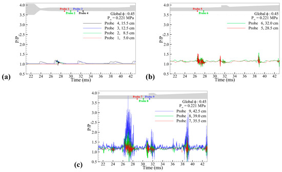 Pressure history of each probe point on the lower wall of the computational region: (a) upstream and (b) downstream of the isolator, (c) fuel injection point.