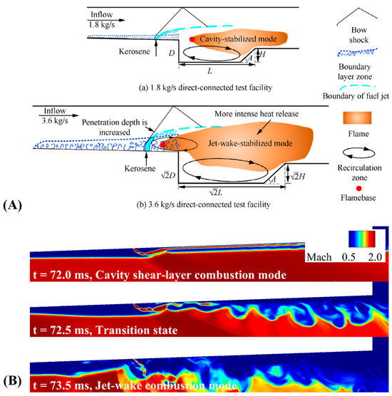 - Wang, H.; Wang, Z.; Sun, M.; Wu, H. Combustion Modes of Hydrogen Jet Combustion in a Cavity-based Supersonic Combustor. Int. J. Hydrog. Energy 2013, 38, 12078–12089. [Google Scholar] [CrossRef]