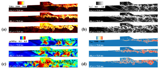 Figure 10 shows the instantaneous results of the pressure field plotted over time, consisting of a single cycle of combustion instability. All data have been divided into sections (A) through (G) according to the specific events. First, in section (A), a primary upstream-traveling shock wave consisting of a multiple oblique shock structure accompanied by a weak pressure gradient was gradually propagated to the isolator. The combustor maintained the cavity shear-layer stabilized combustion mode, and the maximum combustion pressure was homogeneously anchored at the cavity back wall, indicating the stability of the combustion field. However, compared to section (A), where a stable reactive flow field was maintained, disturbances start to occur in the fuel injection region in section (B). Specific events from sections (A) to (C) are shown in Figure 11 and Figure 12.