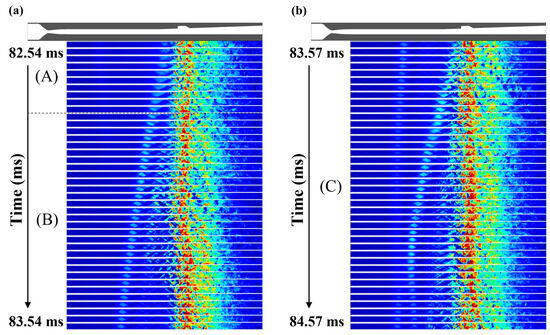As previously confirmed, the upstream-traveling shock wave that causes combustion oscillation or instability depends on the combustion mode and equivalence ratio. In particular, the propagation–dissipation–repropagation cycle within the isolator tends to be very sensitive to the combustion mode. Therefore, it is necessary to classify the dynamics of the upstream-traveling shock wave according to the combustion mode. For this purpose, an equivalence ratio of 0.45 was chosen, in which the cavity shear-layer type and the jet-wake type combustion modes were exhibited simultaneously. This section analyzed the results obtained from 22.58–28.63 ms at an equivalence ratio of 0.45, which induced strong combustion instability in the flow field of the cavity shear-layer combustion mode.