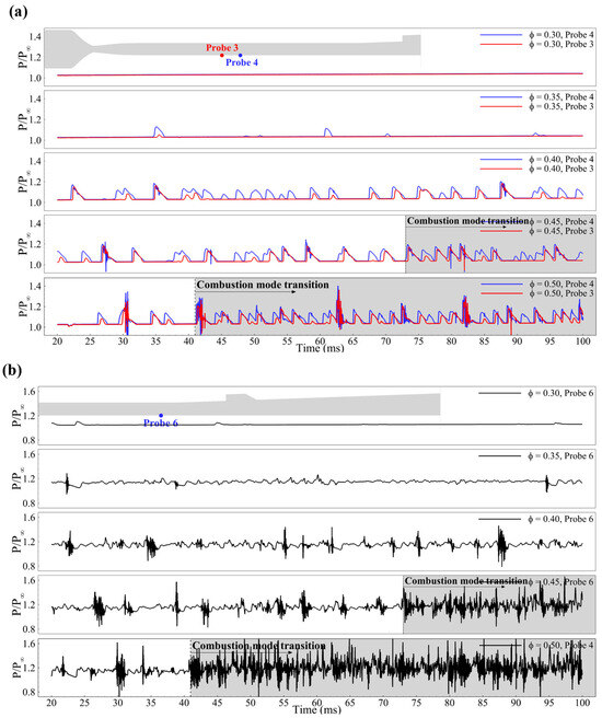 At an equivalence ratio of 0.45, the flow field maintained a cavity shear-layer combustion mode until about 72 ms. However, with a further increase in the equivalence ratio, the combustion mode was changed into the jet-wake combustion mode. The transition in the combustion mode was accompanied by a complete change in the structure of the reactive flow field and a difference in the dynamics of the combustion instability. This section presents the investigation of the combustion mode transition process before identifying the combustion instability characteristics depending on the combustion mode.
