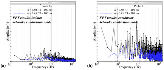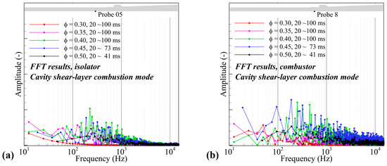Figure 9 shows that the combustion pressure propagated into the isolator at all equivalence ratios. First, at an equivalence ratio of 0.30, the combustion pressure propagated into the isolator but showed a very stable state. At an equivalence ratio of 0.35, the pressure propagation reached the central region of the isolator. In addition, the pressure gradient exhibited a repetitive behavior and induced a weak disturbance in the flow field in the combustor. Due to these dynamics, a weak oscillation was captured where the maximum combustion pressure was anchored. Although a weak combustion oscillation occurred at this equivalence ratio, it did not induce significant changes in the flow field.