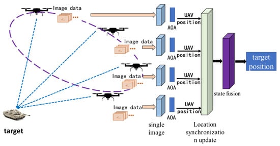 The input parameters for cooperative target localization of numerous UAVs are primarily separated into the following categories: UAV flight status parameters, navigation data, and picture data, among others. The output parameter is the location information of the target, and the specific calculation process is shown in Figure 2.