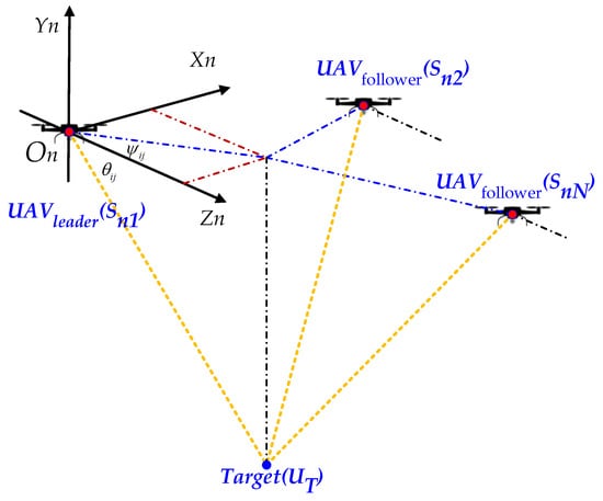 The set of UAVs involved in cooperative positioning is denoted by , where N is the total number of UAVs involved in localization; the set of targets that may be scouted and located is denoted by , where K denotes the total number of targets that can be scouted and located.