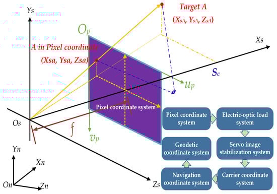 The target positioning solution process has to specify the coordinate system, angle, and coordinate system conversion matrix for a single image. Six coordinate systems: carrier coordinate system, servo stabilization coordinate system, electric-optic load system, and pixel coordinate system, as well as parameters like aircraft attitude angle, electric-optic load installation angle, servo frame angle, and look-down angle [], are involved in addition to the definition of the coordinate systems shown in Section 3.1 and Section 3.2.
