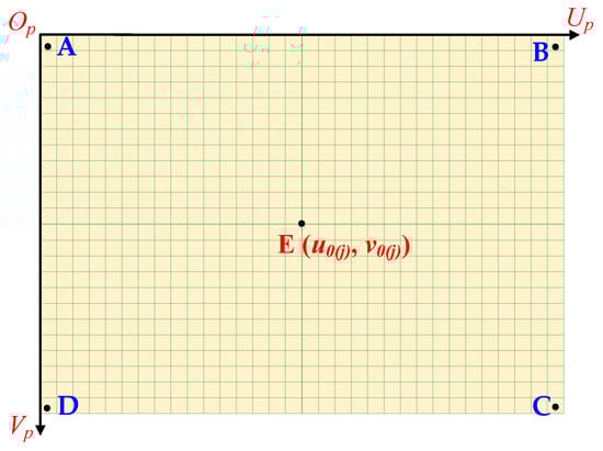 Set the UAV electric-optic load’s longitudinal and lateral resolution to , the half field of view angles in the longitudinal and lateral directions to , the physical dimensions of the image elements in the longitudinal and lateral directions to , the focal length to , and using the definition in Figure 4 we can obtain , and the principal point of the image’s position in the pixel coordinate system to . Target’s pixel coordinates are , image point ’s camera coordinates are , and the transformation between the two-dimensional image coordinate system and the camera coordinate system can be expressed as follows: