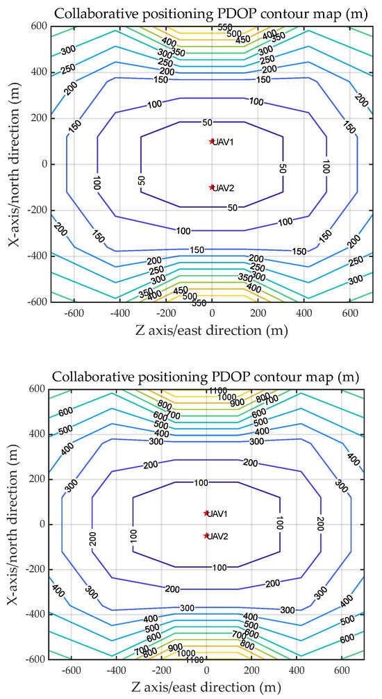 Position Dilution of Precision, or PDOP, is simply a measure of how accurate a location is, and in a satellite positioning system, the degree of the PDOP value indicates how well-distributed the satellite terminals are []. During the cooperative positioning of several UAVs, the DOP value of each measurement site in the reconnaissance region is influenced, with reduced DOP values frequently resulting in higher positioning accuracy []. In order to analyze the error range of cooperative positioning and to suggest optimization ideas, PDOP simulation and analysis of the cooperative positioning of numerous UAVs are employed in this study. The derivation formula in question is displayed below.