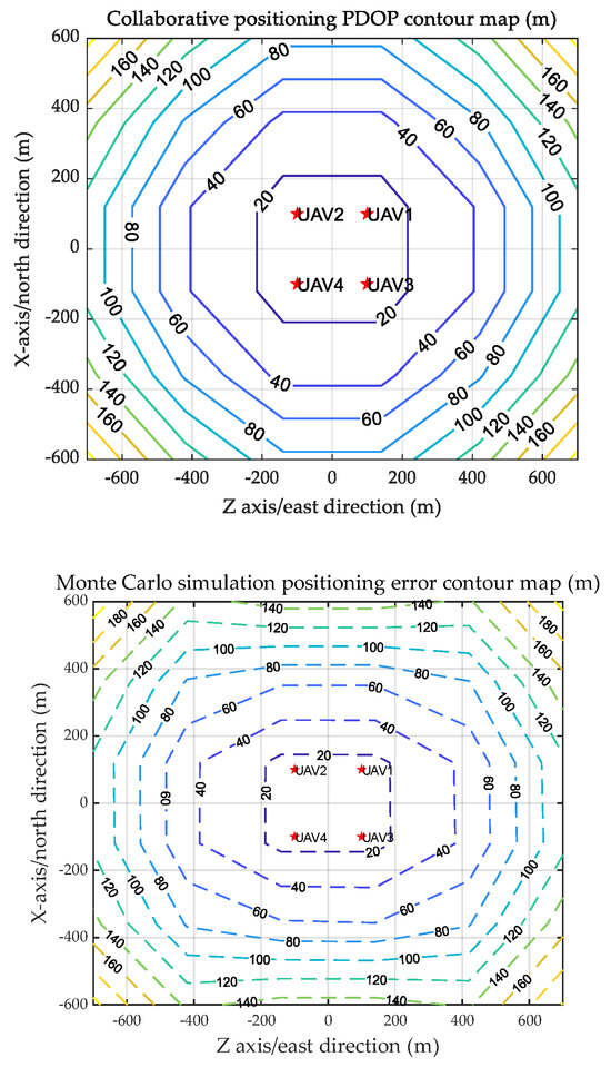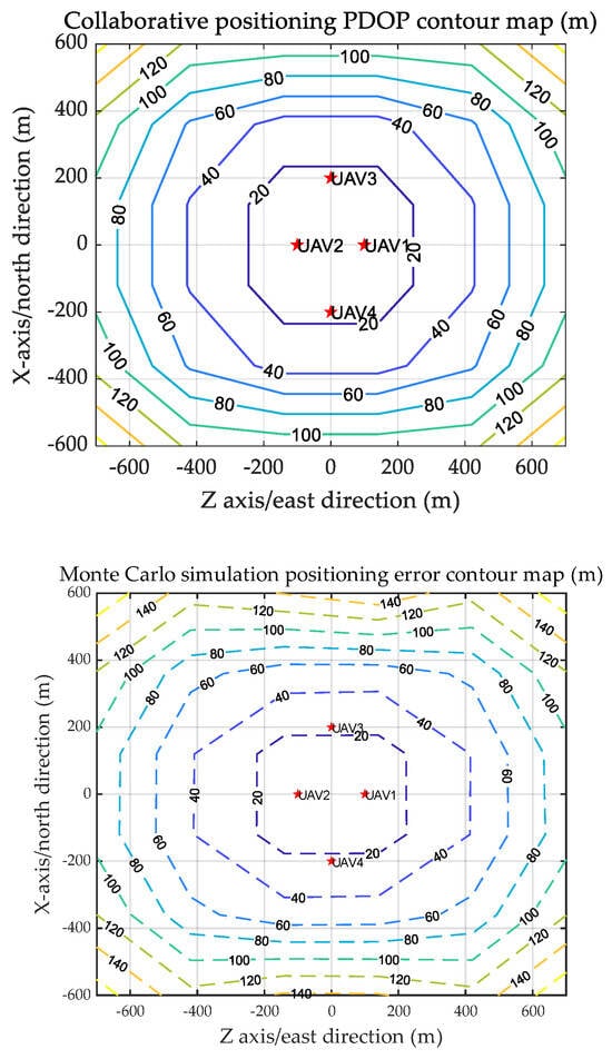 Figure 11 and Figure 12 compare the PDOP values of four unmanned aerial vehicles’ target collaborative positioning under different flying modes with Monte Carlo shooting simulation results. The errors between the two are roughly equal, with a minimum placement inaccuracy of about 20 m.