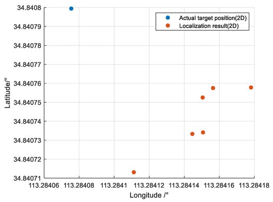 Figure 15 shows the target localization results (the status of UAV collaborative target localization is shown in Table 7, The calculation results of the target position in this state are shown in Table 8). The blue solid dots in the figure represent the true position of the ground identification (target), while the red solid dots represent the results of collaborative target localization by two machines. There are a total of six sets of data. It can be seen that the algorithm can accurately calculate the position of the target in the two-dimensional plane.