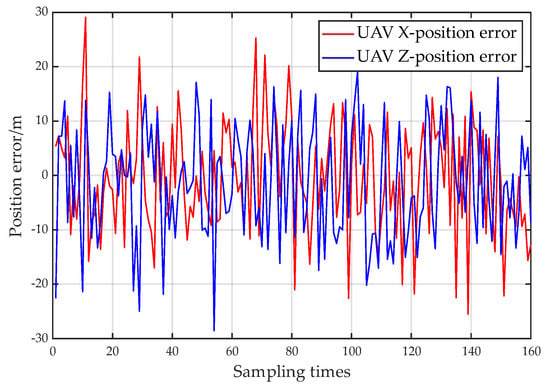 To model the positional adequacy and location error of the UAVs, a random normal error with a mean value of 0 and a standard deviation of 10 m is added to the position of the UAVs’ path. Figure 16 depicts the error between the measuring position and the real position of the UAV.