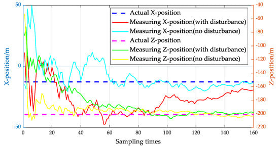 Four UAVs approach the target from various angles. Figure 17 depicts the position result for a stationary object. The target position’s positioning deviance quickly converges from tens of meters to less than ten meters.