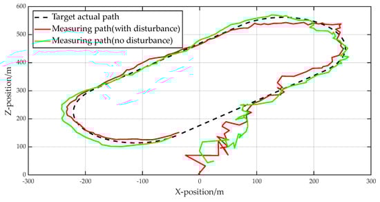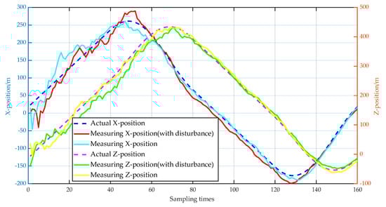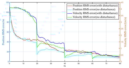 Figure 19 shows the measurement results of the position component when tracking a moving target, and it can be seen that the algorithm proposed in this paper can quickly converge and stably trac the target. Figure 20 shows the position and velocity RMS errors when tracking a moving target, and the tracking accuracy gradually improves with the change of time, the position error converges within 12 m, and the velocity error converges within 0.5 m/s, which also shows that the algorithm has high accuracy under external interference.