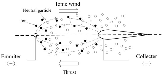 Since the first airplane flight took place in 1903, these vehicles have been controlled by moving surfaces such as flaps, propellers, and turbines. Owing to the advantages of good stealth performance, low maintenance difficulty, and low noise, none-control-surface aircrafts (NCSAs) have received a lot of research [1,2,3]. Unmanned aerial vehicles (UAVs) are increasing rapidly in popularity for use in both military and civil applications [4,5,6,7,8], which makes NCS-UAVs an important subject for research on NCSAs. In 2018, the first unmanned aerial vehicle (UAV) without moving surfaces was successfully tested for the first time [9]; it was propelled by an electroaerodynamic (EAD) thruster. The emergence of EAD-UAVs has provided a huge impetus for the development of NCS-UAVs. EAD-UAVs constitute an innovative UAV concept, using high-voltage asymmetric electrodes to ionize air molecules and Coulomb force to push air ions to produce ionic wind, generating thrust. Unlike fixed-wing and rotor UAVs, there are no moving surfaces, such as propellers or turbines, in EAD-UAVs. As solid-state propulsion UAVs, EAD-UAVs have the advantages of very low noise, low mechanical fatigue, and no carbon emissions [10].