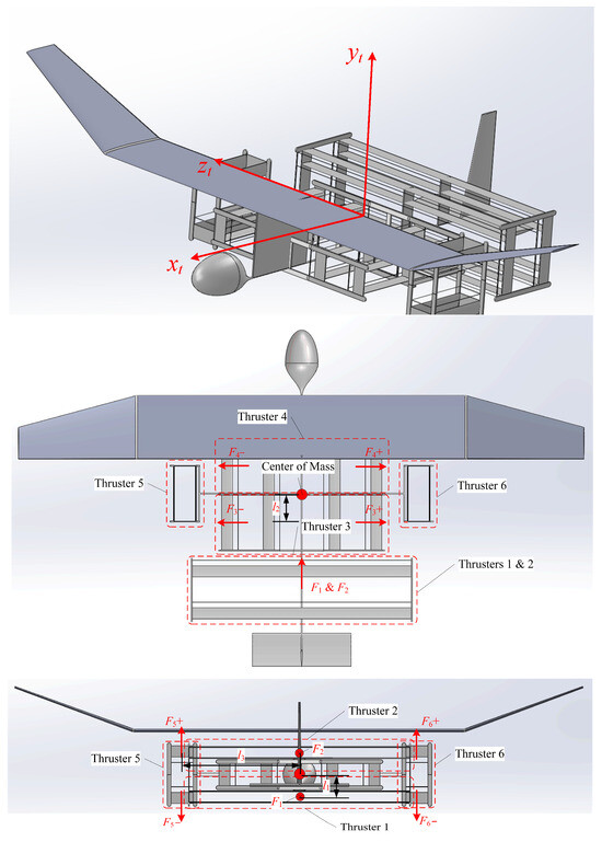where is the distance between the projection of the thrust center of thruster 1 (or thruster 2) on the plane and the center of mass, is the distance between the projection of the thrust center of thruster 3 (or thruster 4) on the plane and the centroid, and is the distance between the projection of the thrust center of thruster 5 (or thruster 6) on the plane and the center of mass, as shown in Figure 2.