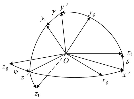 where the pitch angle, , is the angle between the -axis and the plane, the yaw angle, , is the angle between the projection of the -axis on the plane and the -axis, and the roll angle, , is the angle between the vertical plane where the axis is located and the plane as shown in Figure 3.