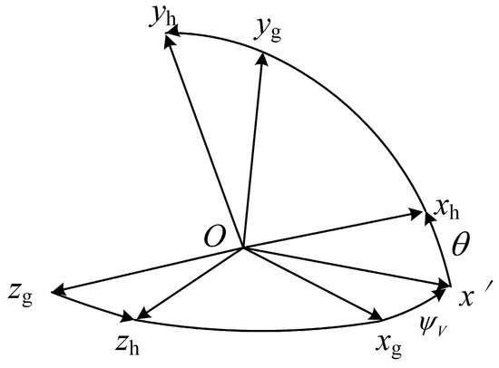 The ground coordinate system, , is fixed to the ground, and the original point, , is selected as a point joined with the ground according to the application. The -axis points perpendicularly upward from the ground, the -axis points to the initial course of the EAD-UAV in the horizontal plane, and the -axis direction is determined by the right-hand rule. By moving the origin, , to coincide with the centroid O of the EAD-UAV, the ground coordinate system, , which is convenient for coordinate system transformation, can be obtained.