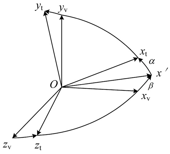 where can be expressed as shown in Equation (12); , , and are the -components of the three coordinate axes in ; and , , and are the -components of the three coordinate axes in :
