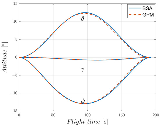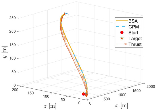 The EAD-UAV designed in this work performs trajectory and attitude coupling control by adjusting the thruster voltage. A trajectory planned without considering the dynamic constraints may not adhere to the voltage limitations of the thruster. Therefore, in this study, a trajectory optimization method considering dynamic constraints was adopted. Trajectory-optimizing algorithms typically use optimal control theory. Popular numerical solutions to optimal control theory include direct methods (“discrete first and then optimization”) and indirect methods (“optimize first and then discrete”) [26], both of which need to be based on dynamics and require considerable amounts of integral calculations. The pseudospectral method is generally used in direct approaches and works well for numerous aerospace problems [27,28,29]. Recently, many improved pseudospectral methods have been proposed. For instance, Rogowski et al. applied the Chebysev pseudospectral method to create the trajectory of a glider in a vertical plane [30]. Further, Pepy et al. introduced an optimal algorithm based on an indirect shooting method [31]. The geometric method was also employed in optimal control theory. Babel et al. applied the shortest path algorithm to deal with network optimization [32]. They divided trajectories in space into multiple line elements, which could act as the UAV trajectory when connected. However, all UAVs’ speeds were assumed to be constant, so the path length was chosen as the optimization goal. The Pythagorean line graph (PH) method is another impressive geometric method to solve the collaborative path planning problem [33,34,35]. Dynamic constraints are described using geometric differential properties such as curvature and torsion. Although these pure geometric methods have advantages for computational efficiency, they lack consideration of the dynamic characteristics of UAVs. In task allocation when designing numerous UAV trajectories, a practical task planning approach can effectively filter results by applying a pure geometric method. However, this approach may make some tracks difficult to fly. The trajectory generation method based on Bezier curves adopts a combination of geometric and dynamic methods, meaning it can be called a geometric–dynamic method [36]. Further, Petropoulos and Longuski introduced the shape function concept [37], and Jolly et al. used Bezier curves for robot path planning [38]. Bezier curves have been employed to link lines or circles to obtain better curvature smoothness and continuity for UAV trajectories [39,40]. Another similar approach is the B-spline method [41]. In terms of spacecraft trajectory planning, inspired by the shape function concept proposed by Petropoulos et al., Huo et al. applied Bezier curves to the initial three-dimensional trajectory planning of solar sails and proposed a method of quickly generating the minimum-time three-dimensional trajectories of spacecraft propelled by solar sails using feedback control. The simulation results show that, considering the actual characteristics of the thrust vector, this method can design the transfer trajectories of spacecraft propelled by solar sails equipped with the feedback control devices with high accuracy in approximately 1% of the time required by the traditional Gaussian pseudospectral method [42,43,44]. Xiaoliang studied methods of continuous-curvature bounded path planning of fixed-wing UAVs based on Bezier curves [45], and Yu et al. conducted research on the fast generation of the trajectories of multiple UAVs arriving simultaneously based on spatiotemporal Bezier curves [46]. In this study, we investigated the attitude–path coupling dynamics and optimal control of EAD-UAVs via the Bezier shaping approach (BSA).