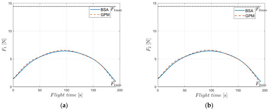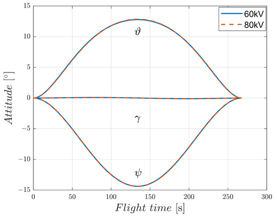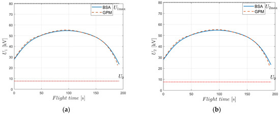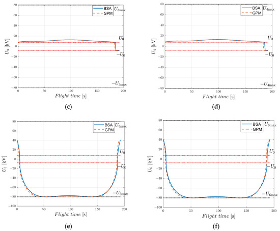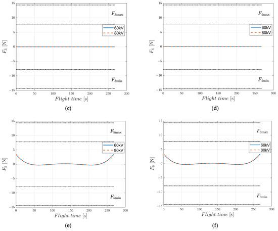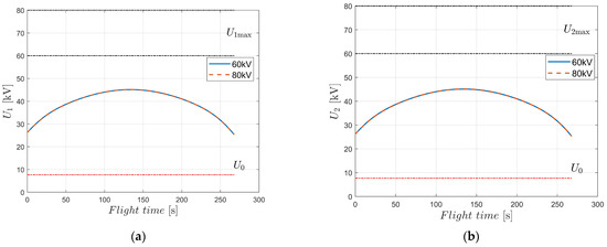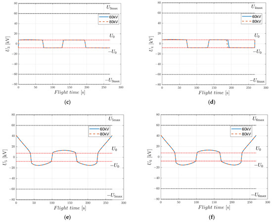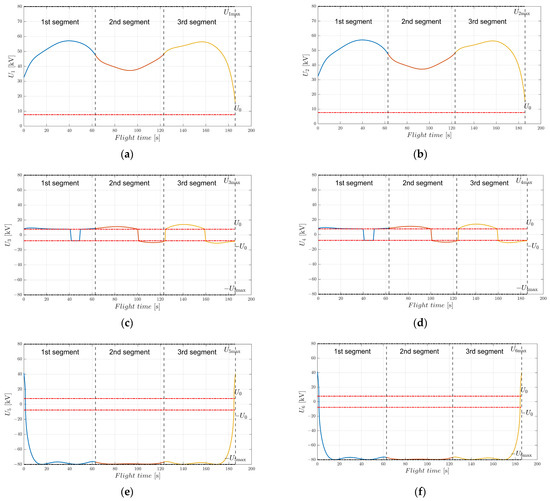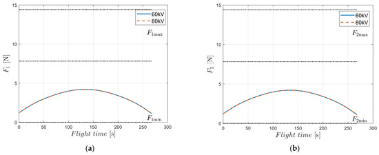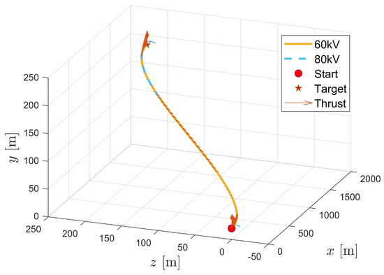 It can be seen from Equation (14) that after corona discharge occurs (that is, when the applied voltage is greater than the corona initiation voltage), the thrust of the EAD thruster increases monotonically with increasing voltage, so the applied voltage, , can be given by Equation (24) in the form of a function of the EAD thrust, . Therefore, the control variables of the dynamic equation of an EAD-UAV can be expressed by using and their first and second derivatives.