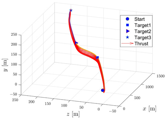 This paper describes the trajectory planning problem of multi-point exploration using an EAD-UAV. The EAD-UAV leaves the starting point of the flight trajectory at moment and reaches the first target point at moment . Then, the EAD-UAV arrives at the k-th objective at moment , where the superscript k = [1, N] is the parameter and corresponds to the k-th segment of the trajectory (that is, the trajectory between the (k–1)-th objective and the k-th objective). The optimal EAD-UAV control law can be obtained by taking the minimum total flight time of the flight trajectory of an EAD-UAV flying over the N targets as the optimization objective, that is, the voltage distribution of the six EAD thrusters at each moment, . Therefore, the objective function of the optimization problem can be expressed as