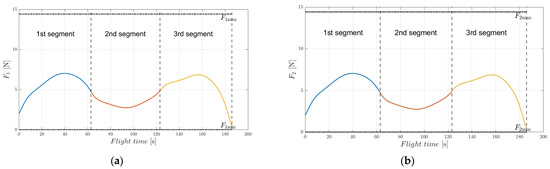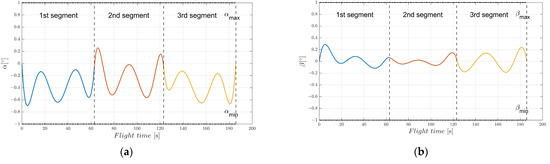 For the multi-point continuous optimization problem of EAD-UAV trajectories, besides the boundary constraints at moments and , the boundary constraints of the k-th trajectory at moment should be considered. The position, velocity, track angles, and attitude angles of the EAD-UAV in the ground coordinate system at and and the triaxial angular velocity in the body coordinate system at and are known quantities; the boundary constraints at moments and are given by