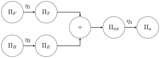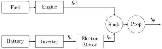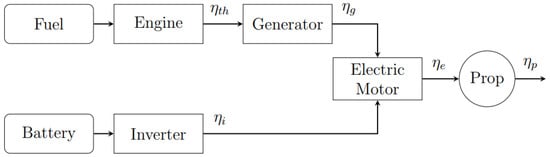 As performed in [,], a generalized formulation for both configurations can be achieved merely by defining overall efficiencies, as shown in Table 1. It is possible to define a generic representation in which we have two branches representing the two sources of energy (fuel and batteries) called branch 1 and 2, respectively, and the dissipating branch indicated with 3 as shown in Figure 3. Assume that the aircraft travels a straight trajectory at a constant altitude. Assume that the power required by drag is instantaneously equal to the available propulsive power .