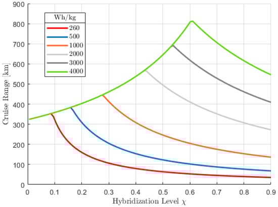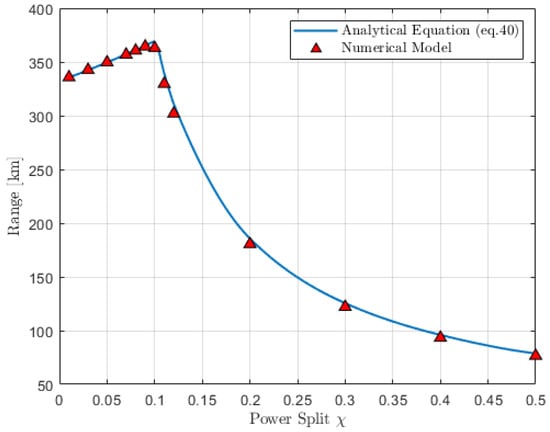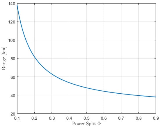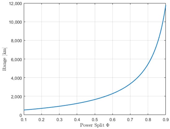A fixed value of independent from the battery state of charge has been selected. The graph in Figure 5 shows that if the power split is increased then the range of the airplane goes to infinity, but this is inconsistent: if the amount of electric energy stored is known in advance, there is no way the range could increase using more electric power. This means that cannot assume any value. Hence, another definition of depending on the battery and must be formulated.