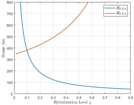 The range of the real hybrid aircraft is given, for a certain value , by the minimum between the VTA range and the VEA range.