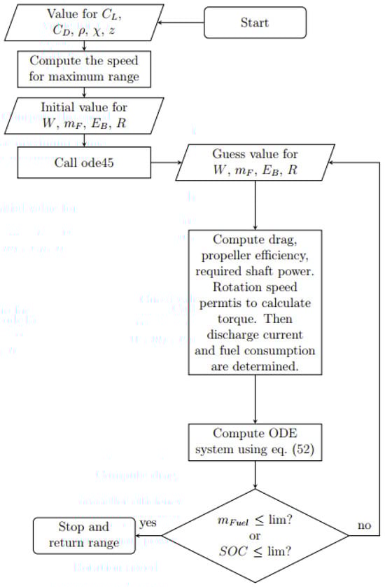 The numerical model uses the equations of flight mechanics together with experimental data such as the operating curves of the propeller, internal combustion engine and electric motor. As input, it receives the aeroplane’s mass values, altitude, flight altitude, and degree of hybridization. The user also sets a limit on fuel consumption and energy stored in the batteries. The initial conditions are the fuel and energy level at the start of the cruise. The system of equations modeling the trend of residual fuel mass and residual energy is integrated over time. The integration is interrupted by a stopping criterion based on the fuel and state of charge (which is linked to the residual energy in batteries).