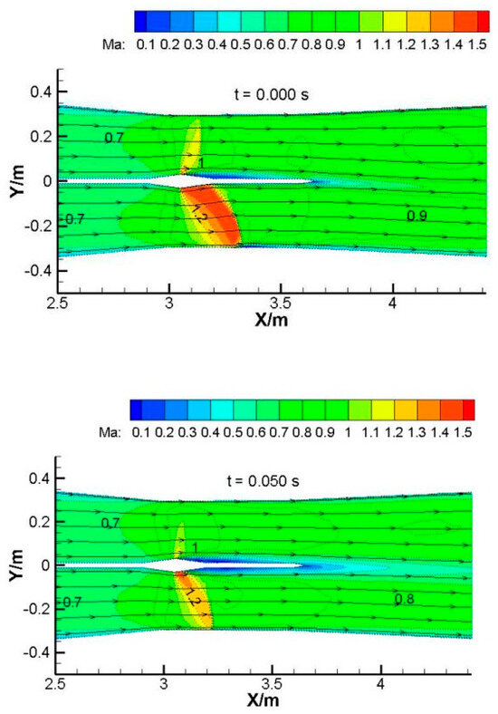 The degree of shock-induced separation is very sensitive to changes in shock intensity. With the alternate appearance and disappearance of separation bubbles, the separation shear layer becomes a highly unstable flow. This shape change in the separation bubble results in alternate thickening and thinning of the wall boundary layer, causing the core flow to oscillate slightly in the normal direction. Bourgoing’s experiments showed that the shock wave changed with time in both the flow direction and the normal direction [37]. Therefore, even if the flow field is symmetrical, the flow may be unsteady, especially in complex transonic flows. Hsieh compared the effect of downstream pressure changes on the flow in the diffuser section, which was significantly more complex [28].