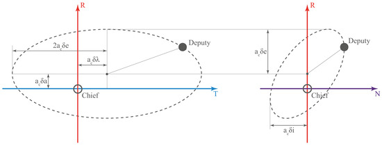 One of the advantages of the adopted ROEs is that they provide a direct insight on the shape of the relative orbit, unlike the relative position and velocity vectors, which need to be integrated over time in order to obtain a intuition of the relative orbit. Given the set of ROEs in (2), the shape of the relative orbit can be constructed as an ellipse, in both the transversal–radial and normal–radial planes (see Figure 1).